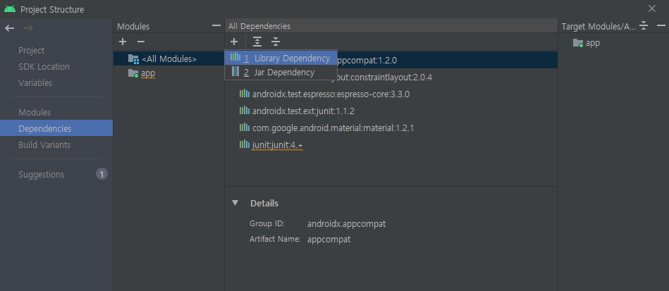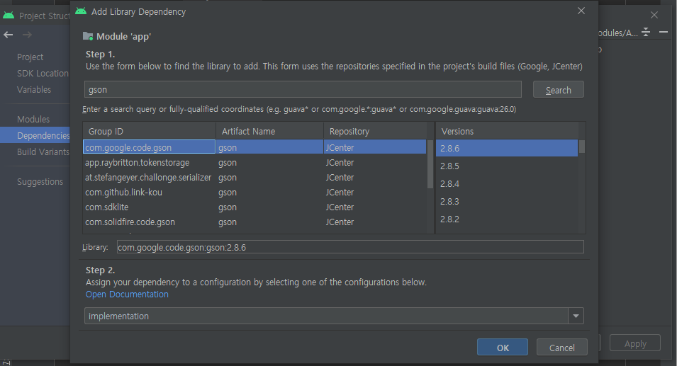 Ctrl+Shift+Alt+S>Dependencies>1 Library Dependency>gson 검색>com.google.code.gson>최신버전>Apply