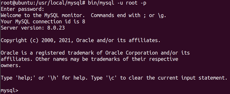 올바른 비밀번호를 입력하면 다음과 같이 환영 문구가 나온다. 또한 #에서 mysql>로 바뀐다.