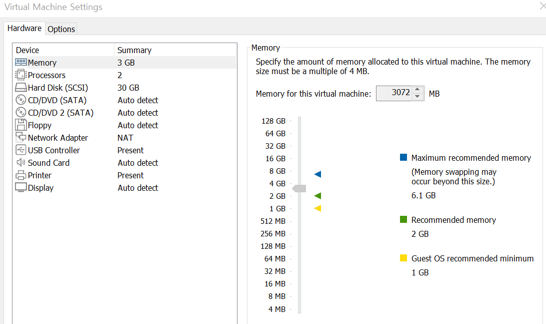 다만 한 사이트의 글을 보고 가상 머신의 시스템 설정에서 메모리를 2GB에서 3GB로 올려해결하였다. (4GB로 올리려 했지만 노트북의 한계로 3GB로 설정)