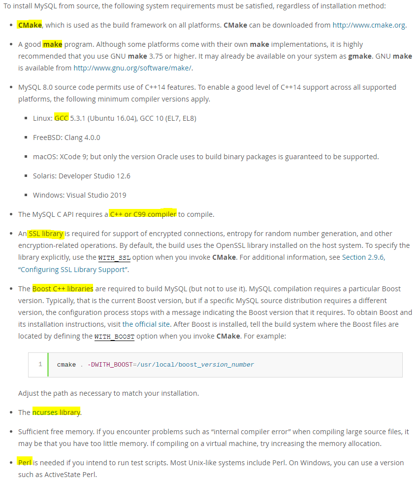 2. make : GNU make 3.75 이상3. GCC : MySQL8.0 소스코드가 허용하는 C++14를 사용하기 위한 컴파일러. 최소 GCC 5.3.1.4. C++ or C99 compiler : MySQL C API가 필요로 함 5. SSL library : 암호화 관련 작업을 위해 필요.