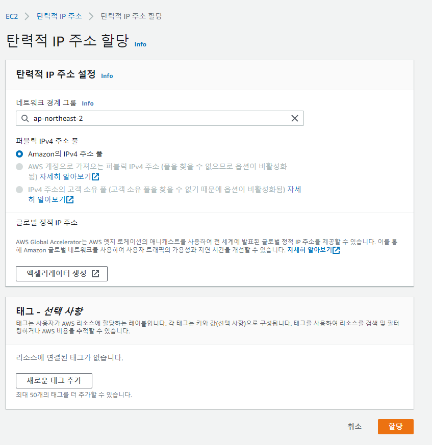 탄력적 ip 할당받기인스턴스에 ip 연결하기(+) 탄력적 ip 해제하기