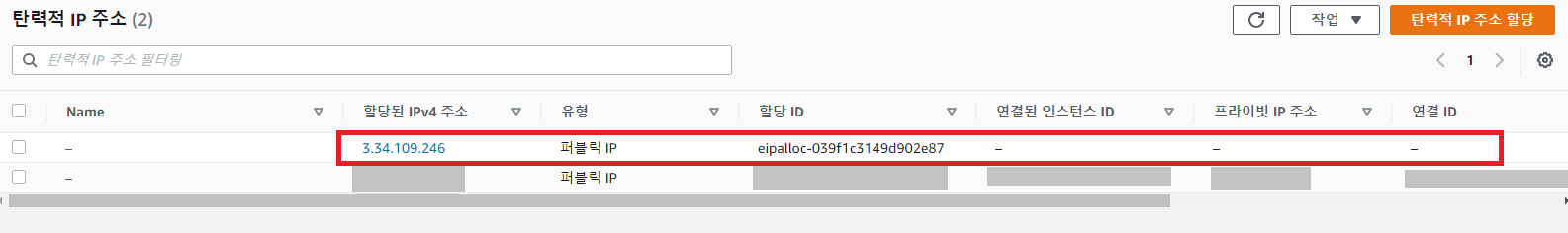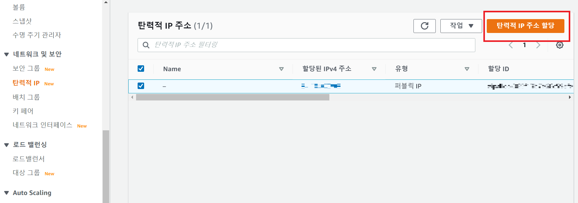 따라서 ip를 고정하기 위해 Elastic IP(탄력적 IP)를 할당해주어야 한다.