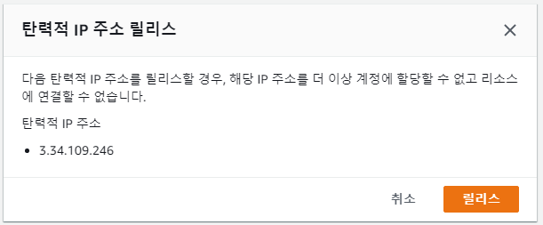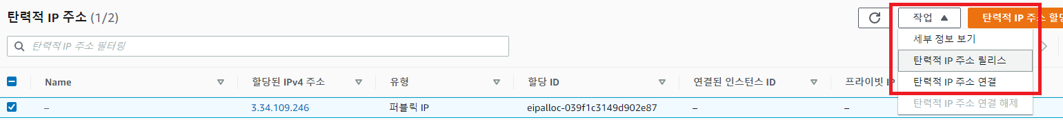해제할 ip를 선택한 뒤 '작업 > 탄력적 IP 주소 릴리즈'을 선택한다.