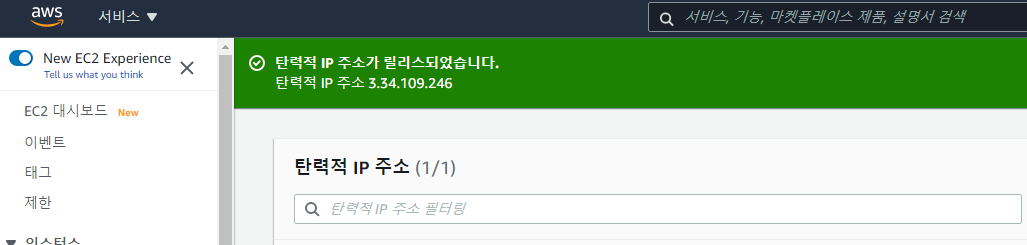 ip 해제가 성공적으로 되었다면 탄력적 IP 주소 목록에서 해당 ip가 사라지고, 다음과 같이 초록색으로 릴리스되었다는 메시지가 나타난다.