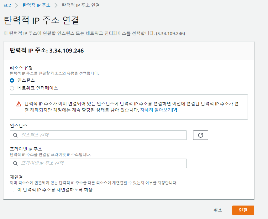 새로 할당된 IP를 인스턴스에 연결해줄 차례이다.